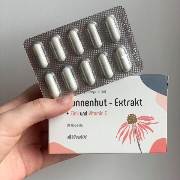 Nahrungsergänzungsmittel enthält Sonnenhut-Extrakt, Vitamine und Mineralien. Es enthält Zink, Selen, Kupfer, Vitamin C und B6 , die die normale Immunfunktion unterstützen.